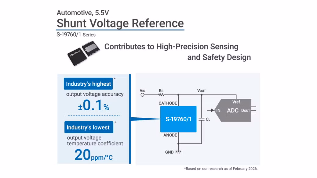 Ablic launches a new series of automotive shunt reference ICs, the S-19760/1, with output voltage accuracy of ±0.1% and output voltage temperature coefficient of ±20ppm/℃. The ICs are primarily used as a reference voltage for A/D converters, which convert analogue sensor signals into digital values.