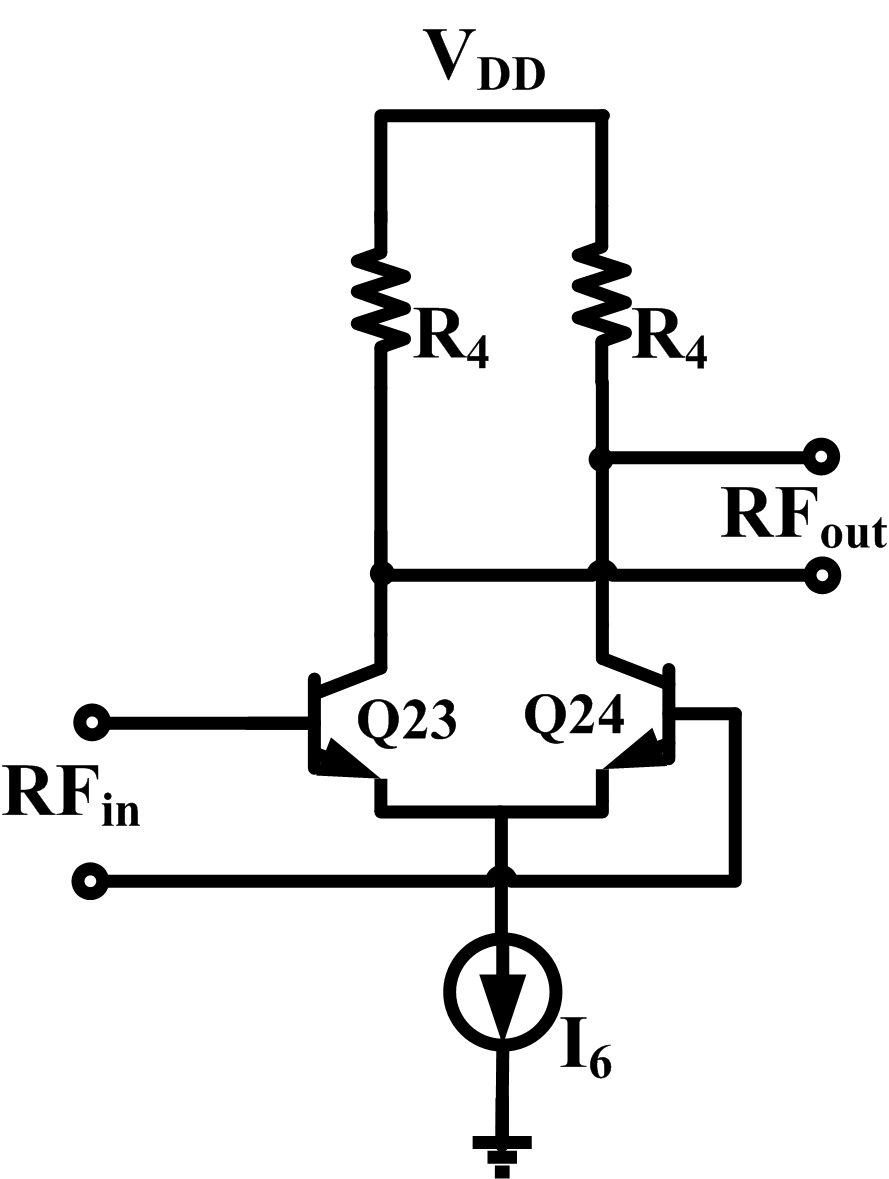 Figure 4 shows a simple output buffer with two collector load resistors R4 of 50W, matched to the input impedance of the test instrumentation. A tail current I6 is provided to keep the moderate output amplitude.