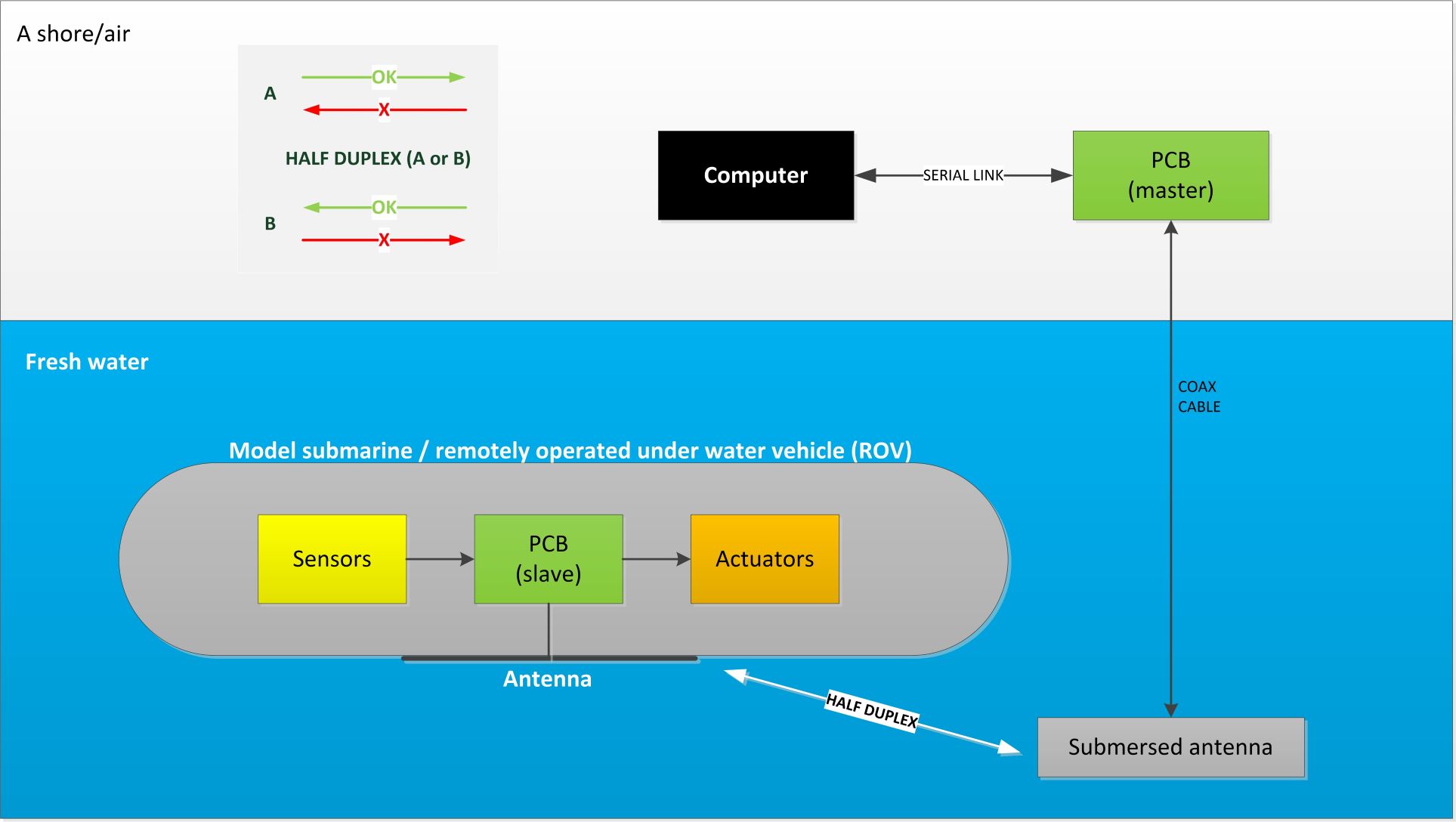 By moving the computer from model to shore, we avoid taking the submersible out of the water for a software change, leaving on board mainly actuators and sensors. While doing so the effect of changes made to the software can be observed instantaneously. Thus, a two-way communication is required between shore and model, which can be sound, light or radio waves. I avoid using cable since it can affect the model’s course, but also it can become entangled in the propeller. Hence, I opted for radio waves, which because of radio regulations are not allowed to travel through the air, forcing me to explore underwater radio communications in fresh water (the range is too limited in salt water).