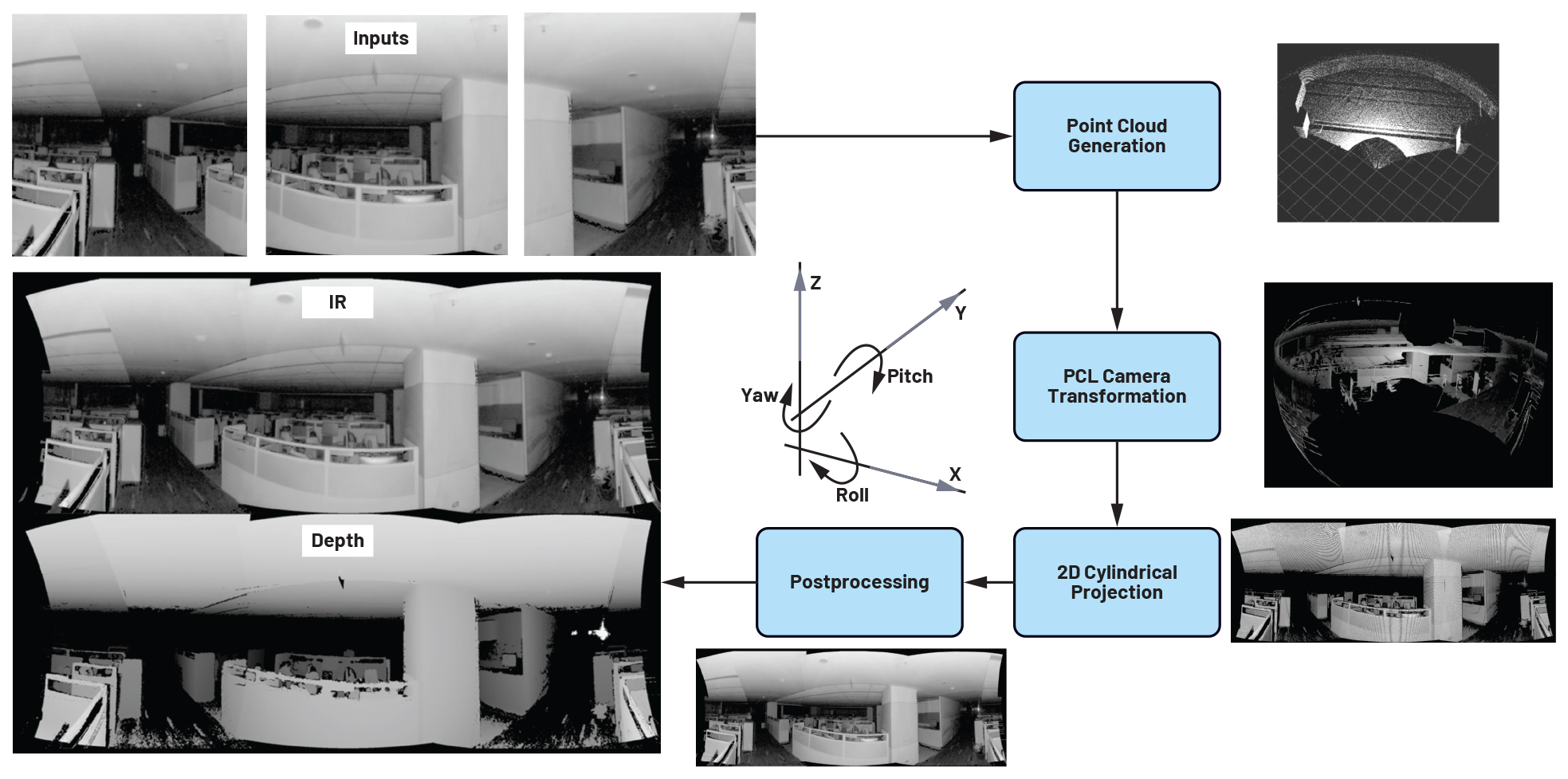 The combined point cloud of the FOV is projected to a 2D canvas using a cylindrical projection algorithm also known as front view projection; see Figure 4. In other words, the algorithm projects each point of the merged point cloud onto a pixel in the 2D plane, which results in a single continuous panoramic image covering the combined field of view of all the sensors. This results in two 2D stitched images: one for stitched IR and another for stitched depth images projected onto 2D planes.