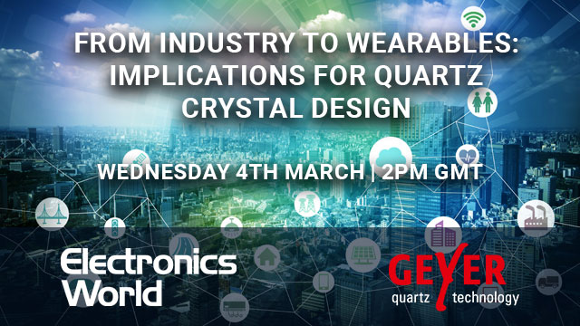To answer your questions on modern designs that must incorporate crystals and oscillators, join us – Electronics World and GEYER Electronic – at the webinar titled “From Industry to Wearables: Implications for Quartz Crystal Design”.Â