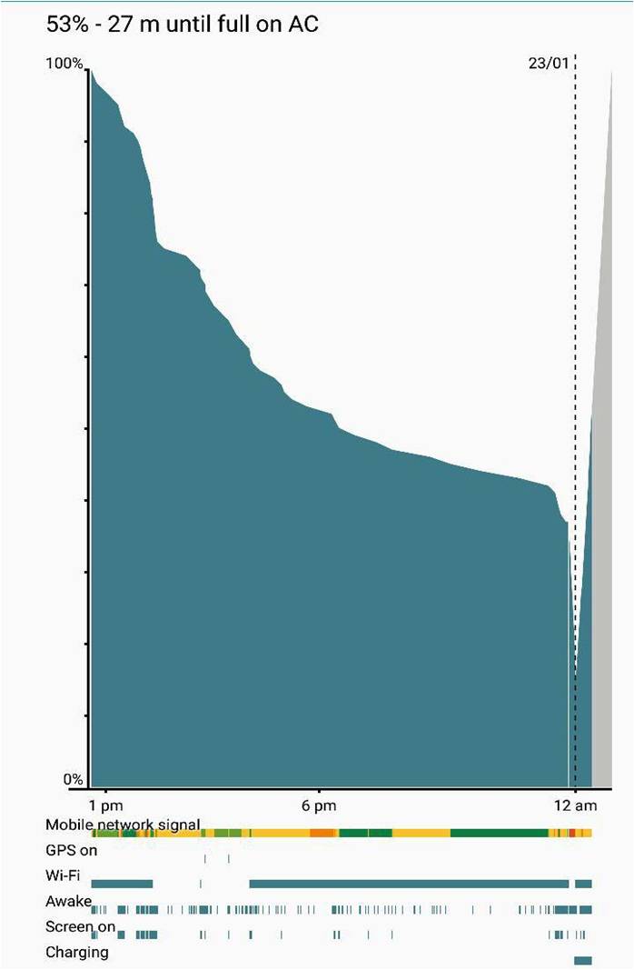 In Figure 12, when the device was in off-charger state (unplugged), the battery’s full cycle was one day, 10 hours and 49 minutes, with 3.83 hours Screen-On-Time. This significant improvement in power efficiency proves how kernel optimisation plays a major role when creating an efficient power system.