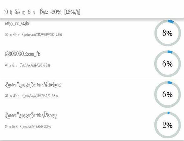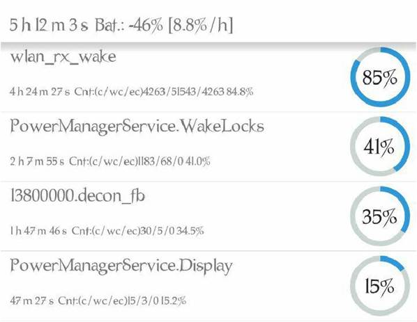 In Figure 4, ‘wlan_rx_wake’ was awake 85% of the time during the last five hours (after unplugging the charger), leaving the battery with 54% capacity.