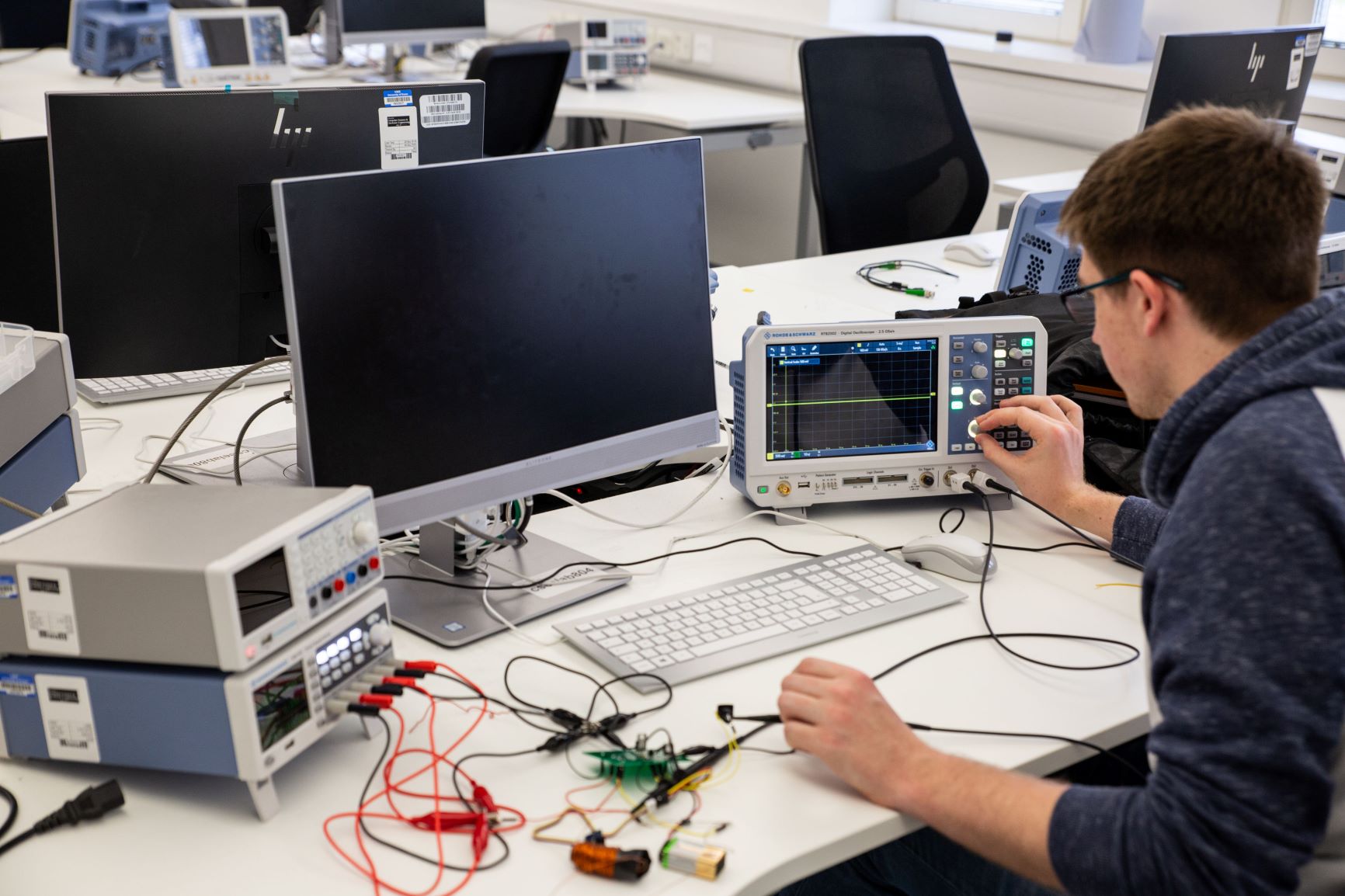 The University has equipped each workstation with an R&S RTB2000, which offers an oscilloscope plus logic and protocol analyser, waveform and pattern generator and digital volt-meter in a single compact case. This not only reduces the overall investment in test equipment, but also saves valuable space at each workstation. The built-in web server functionality enables students and lecturers to display their oscilloscope screen content to the classroom and over a network. Other features of the oscilloscope that appeal particularly to students include gesture recognition.