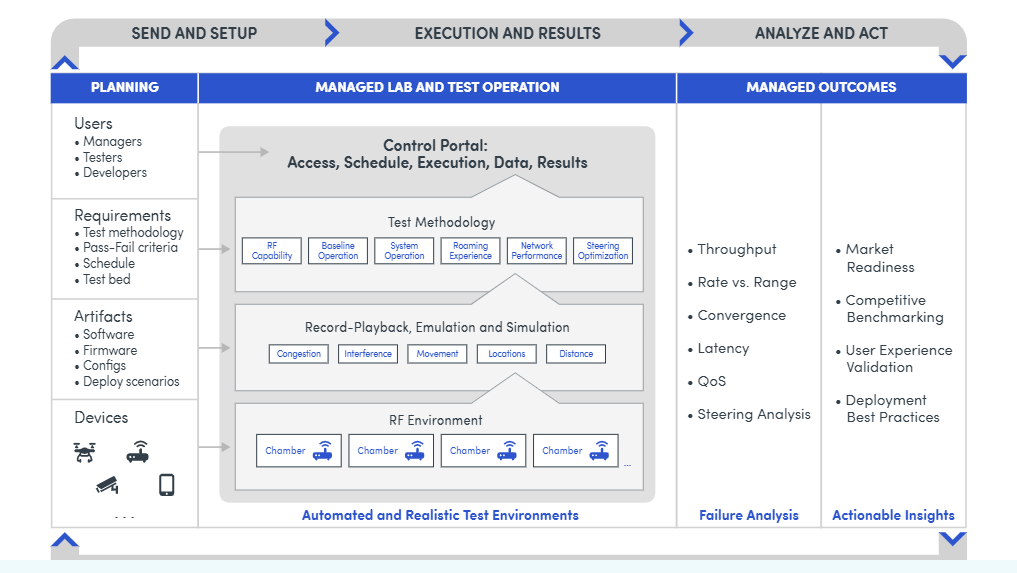 “While many test facilities use software-based testbeds, these are unable to perform realistic test scenarios that model actual deployments,” said Roberts. “They often lack the ability to produce deterministic results which is essential for repeatability. By utilizing our OCTOBOX testbeds along with our automation framework, we emulate real world scenarios such as congestion, interference, distance, and movement – all of which affect the quality of the user experience.”