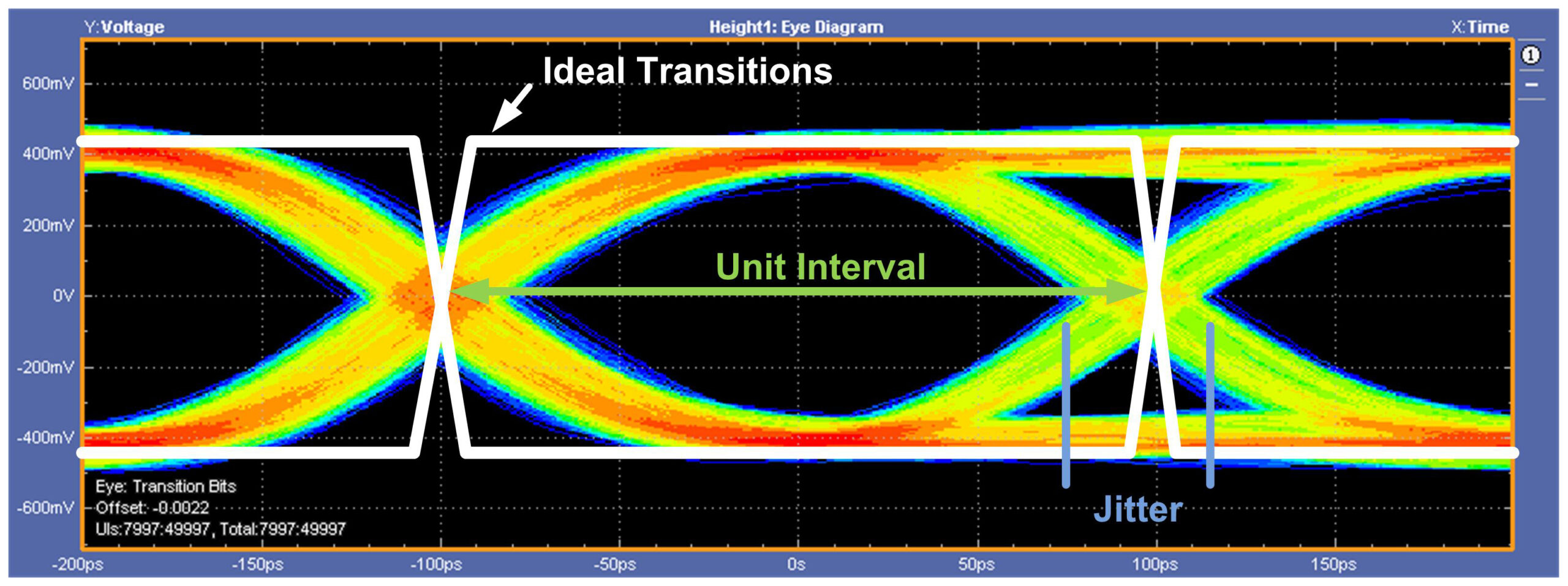 The ideal waveform is overlaid on a measured waveform. Ideally, the transitions would be almost instantaneous with no over- or undershoots and with no ringing. In addition, the cross points that determine the UI should be without jitter.