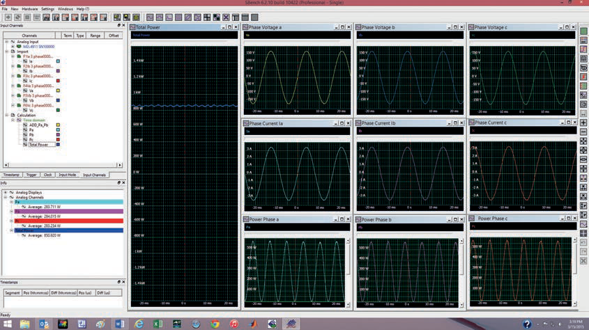 Real-time calculations, shown in the Info pane on the left, show the average values of the individual phase power waveforms along with the total power. The sum of the average values of the three phase-power measurements equals the average total power, in this case 850.9W.
